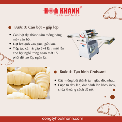 Hướng dẫn cách làm bánh Croissant (bánh sừng bò) với thiết bị bếp công nghiệp Hoa Khanh: máy trộn bột, tủ ủ, máy cán bột và lò nướng công nghiệp. Giải pháp tối ưu cho tiệm bánh, khách sạn và bếp trung tâm.